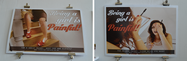 What she came up with is a really smart series of photographic posters. Firstly, I think these are great conceptually because they target young people instantly with their strong images and captions since they depict common problems that people at this age can identify with - then they provide the essential information of how to solve these problems to prove the importance of first aid. Secondly, I really love the colour scheme; a muted, low contrast image under white and red text to make the tag line stand out and a black bar along the bottom to deliver the serious information combined with an appropriate, and well-placed, typeface to create a vintage style.